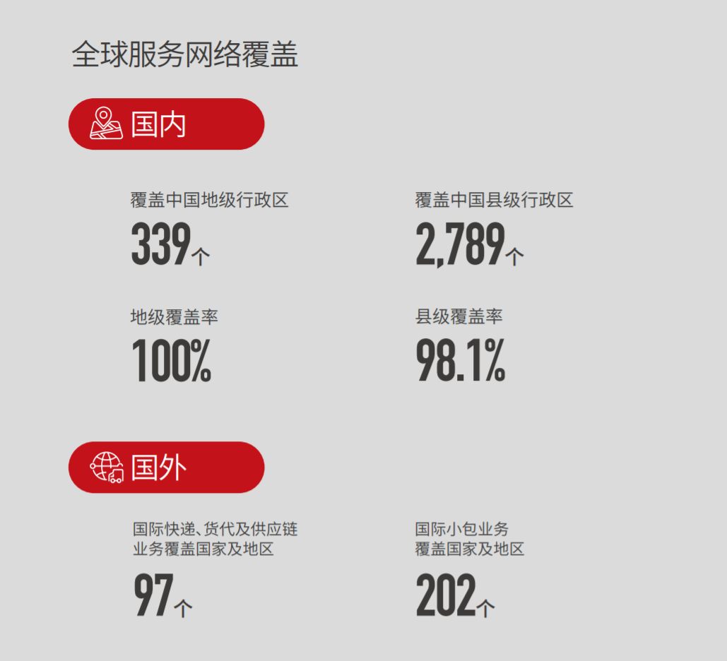 截至2023年末,顺丰控股的服务覆盖中国100%的城市及全球202个国家和地区,并运营着多条陆运、铁运、海运资源和线路,能够为客户提供国内及跨境的零担及大宗货物多式联运服务。在收购整合嘉里物流后,顺丰控股大大增强了在东南亚本土市场的覆盖率及连接亚洲与世界的国际货运能力。