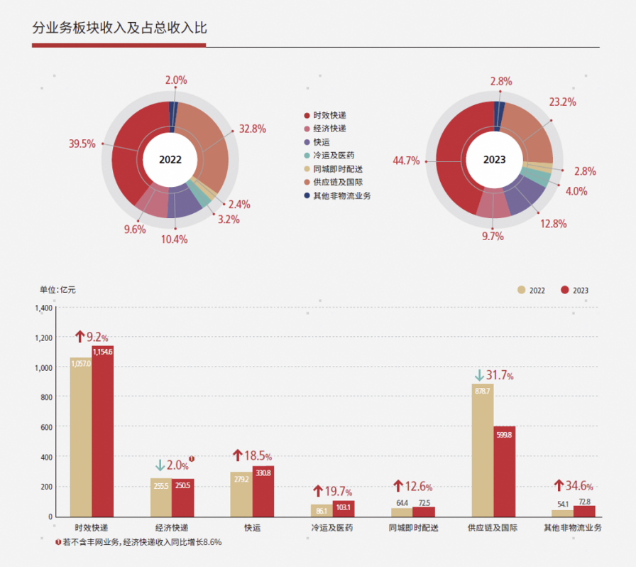 不断调优产品结构之下,顺丰控股的经济快递业务2023年更聚焦于中高端电商市场;得益于对市场趋势的精准把控,经济快递业务2023年实现营收约250.5亿元,不含丰网业务,该板块收入同比增长8.6%。