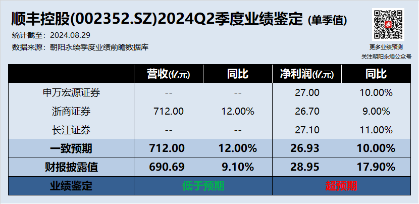 结合以上数据,顺丰控股2024年二季度营收低于预期,但净利润超预期。