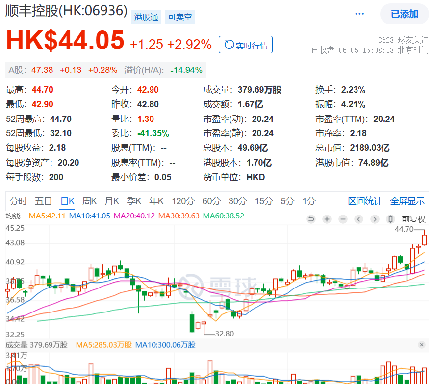 截至6月5日收盘,顺丰控股报43.20港元/股。近日,“大摩”指出,未来2-3个季度利润增长预计快于主要同行,看好顺丰控股中长期发展和盈利表现。
