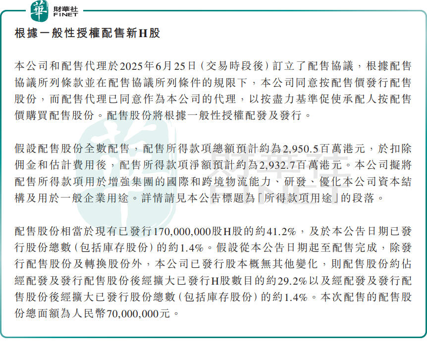 公告显示,公司拟配售7000万股新H股,配售价为每股42.15港元,较昨日(2025年6月25日)收市价折让约8.8%。本次配售预计募资约29.5亿港元,所得款项净额(扣除佣金及开支后)约29.33亿港元。