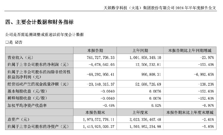 8月21日晚间,天娱数字科技(大连)集团股份有限公司(以下简称“天娱数科”或“公司”)发布2024年半年度报告。报告期内,公司实现营业收入7.62亿元,同比下降23.97%。归属于上市公司股东净亏损667.86万元。归属于上市公司股东的扣除非经常性损益净亏损6829.3万元。基本每股亏损0.004元。公司计划不派发现金红利,不送红股,不以公积金转增股本。