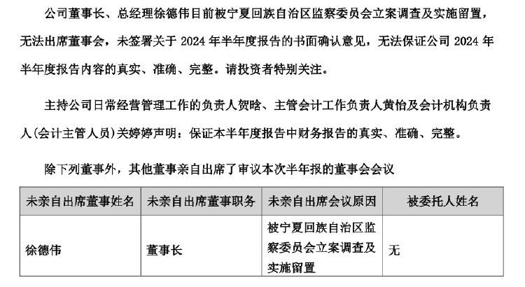 董事长、总经理徐德伟五月被立案调查及实施留置,未签署关于2024年半年度报告的书面确认意见