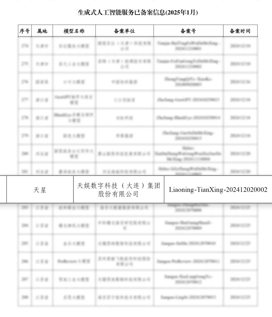 近日,国家网信办发布最新一批生成式人工智能服务备案公告,天娱数科自研基座大模型“天星”已于2024年12月20日成功通过辽宁省第一批大模型备案。至此,天娱数科已有基座大模型天星大模型以及面向3D智能领域的行业大模型“智者千问”两款大模型通过备案。