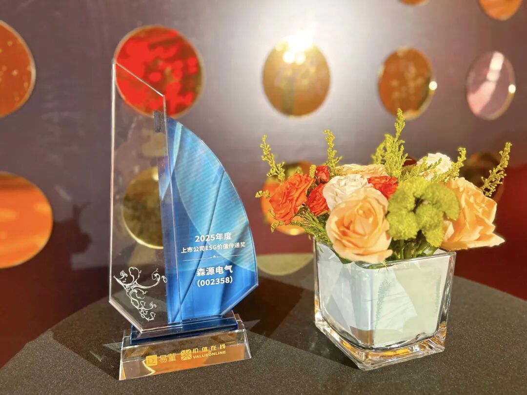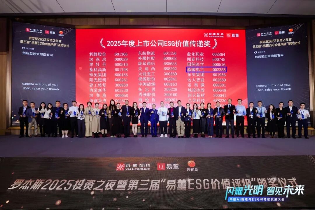 2025年12月1日,以“闪耀光明智见未来”为主题的“中国AI赛道与ESG可持续发展大会”在深圳隆重举行。在同期举办的“易董ESG价值评级”颁奖典礼上, 森源电气 凭借在环境、社会及公司治理(ESG)领域的卓越表现,荣获“2025年度上市公司ESG价值传递奖”。