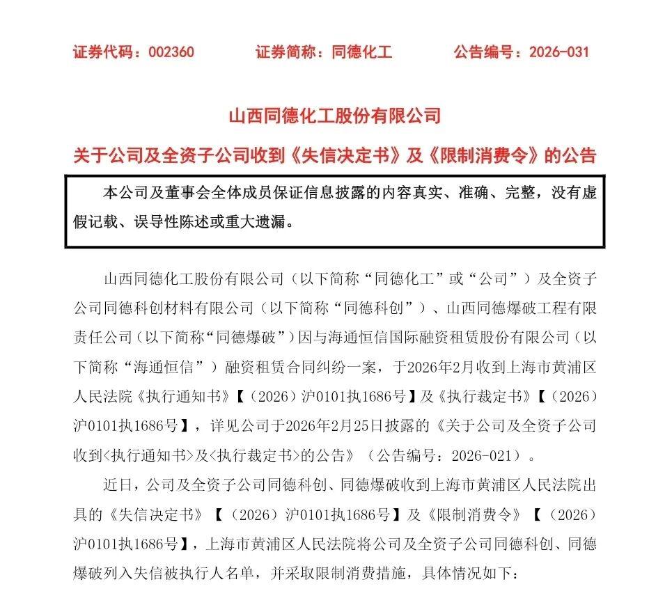 当山西同德化工(002360)一纸《关于公司及全资子公司收到及的公告》发布,这家曾经的山西民爆龙头,彻底撕下了最后一块“体面”的遮羞布。从资本市场的明星企业,到连续被列入失信被执行人名单、法定代表人被限制高消费,同德化工的坠落,不是某一笔债务的偶然违约,而是传统晋商企业在时代浪潮中,因战略误判、杠杆失控、主业失守而引发的系统性危机。