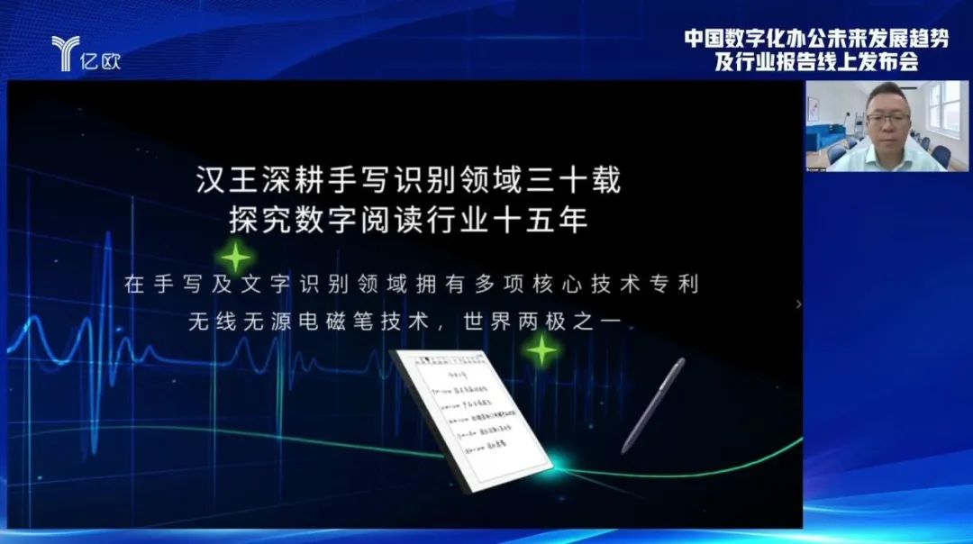 9月9日,汉王科技副总裁王坤做客亿欧中国数字化办公未来发展趋势及行业报告线上发布会,就数字化办公这一概念的演进进行解构,同时结合双碳内涵,介绍汉王科技在数字与无纸化办公方面做出的相关布局。