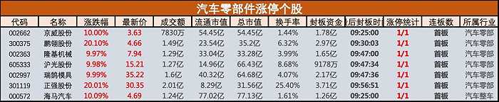 今天汽车零部件板块开盘走势强劲,截止发稿,7只相关股票涨停。