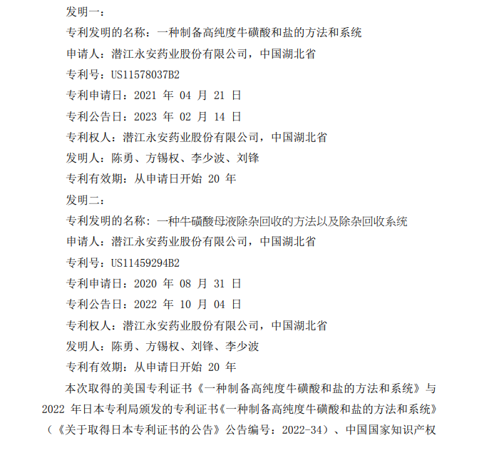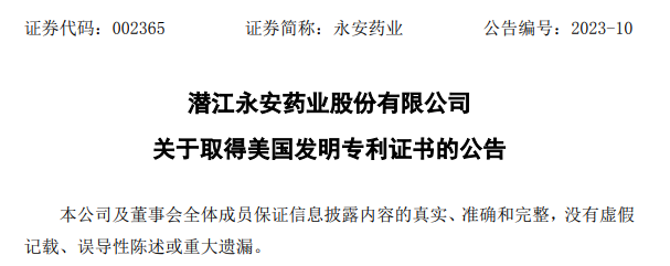 3月1日,潜江永安药业股份有限公司发布公告称,取得2项美国发明专利证书。