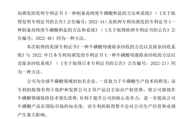 近日,公司收到美国专利商标局颁发的两项发明专利证书,分别为一种制备高纯度牛磺酸和盐的方法和系统、一种牛磺酸母液除杂回收的方法以及除杂回收系统。具体内容如下: