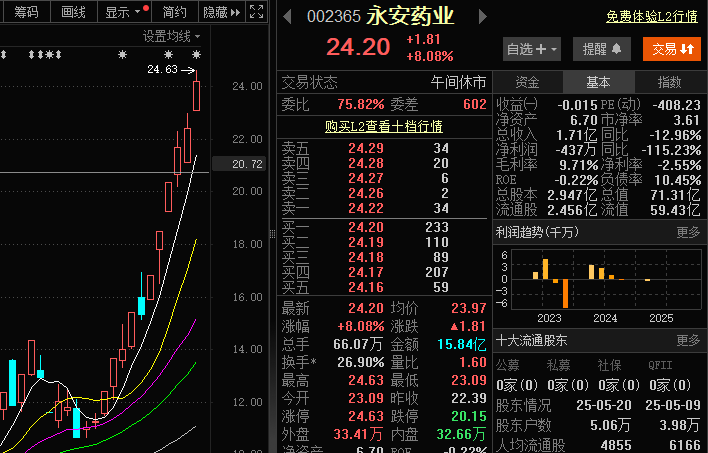 近期,永安药业在股市上的表现颇为引人注目,特别是在5月28日,其股价持续攀升,一度触及涨停板。截至上午交易结束,永安药业的股价已上涨8.08%,最终定格在每股24.20元的高位。