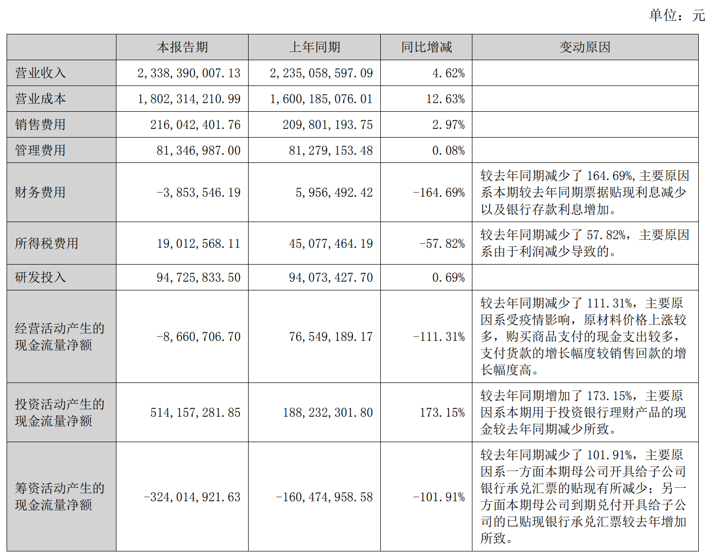 2022上半年,康力电梯营业成本为18.02亿元,同比增长12.63%;财务费用为-385.35万元,较去年同期减少了164.69%,主要原因系本期较去年同期票据贴现利息减少以及银行存款利息增加。经营活动产生的现金流量净额为-866.07万元,较去年同期减少了111.31%,主要原因系受疫情影响,原材料价格上涨较多,购买商品支付的现金支出较多,支付货款的增长幅度较销售回款的增长幅度高。