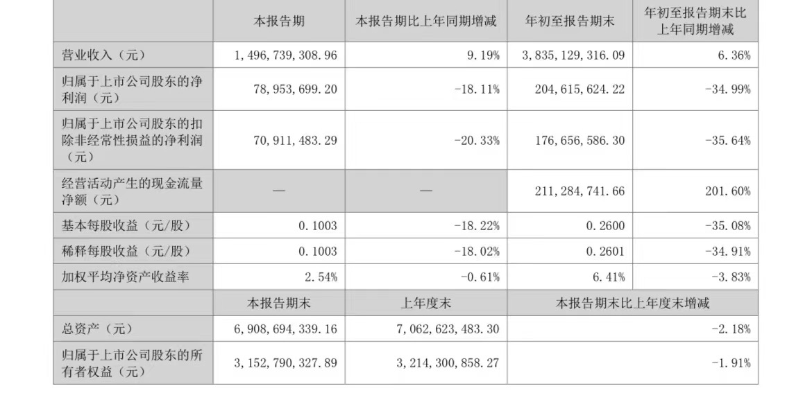 根据公告,今年前三季度,公司实现营业收入38.35亿元,同比增长6.36%;归属于上市公司股东的净利润2.05亿元,同比减少34.99%;经营活动产生的现金流量净额为2.11亿元。