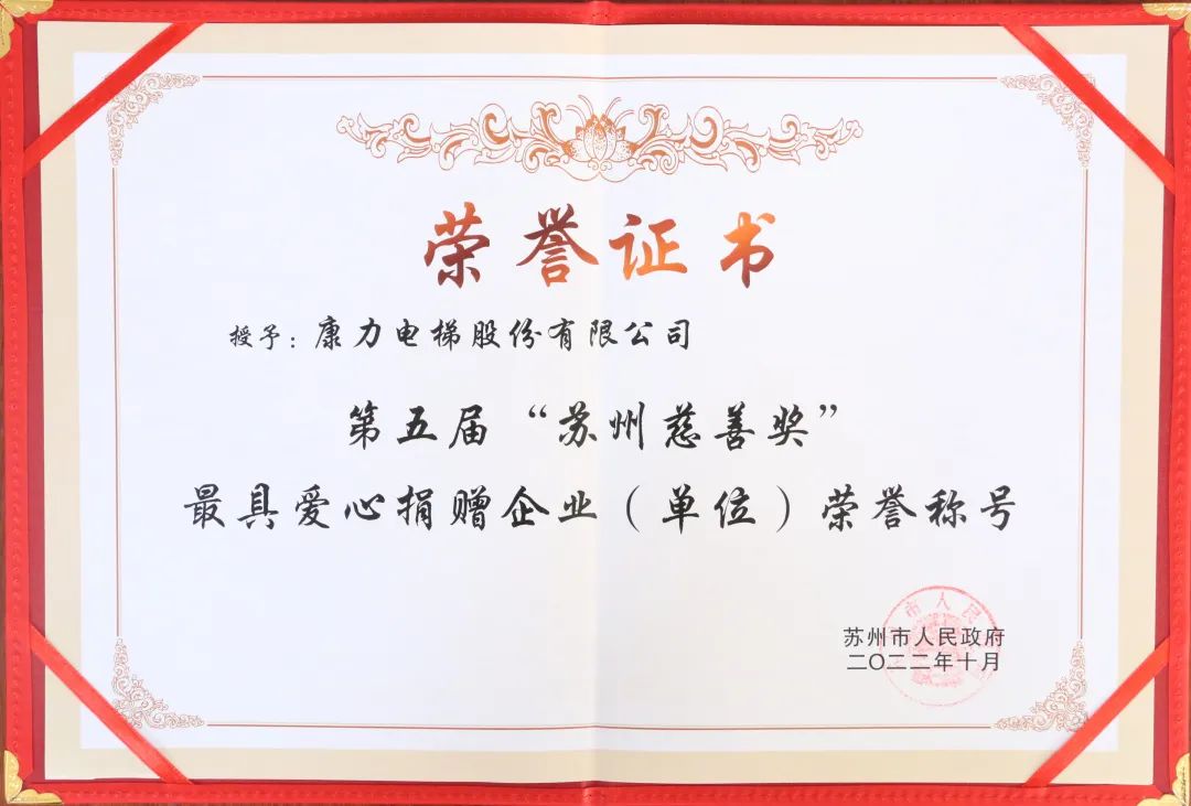 10月20日,第五届“苏州慈善奖”颁奖仪式隆重举行,苏州市委副书记、市长吴庆文出席并讲话,副市长查颖冬主持。47家单位、16家慈善组织、30个个人及团队、24个慈善项目获“苏州慈善奖”称号。作为企业社会责任的积极践行者,康力电梯获评第五届“苏州慈善奖”最具爱心捐赠企业(单位)荣誉称号。