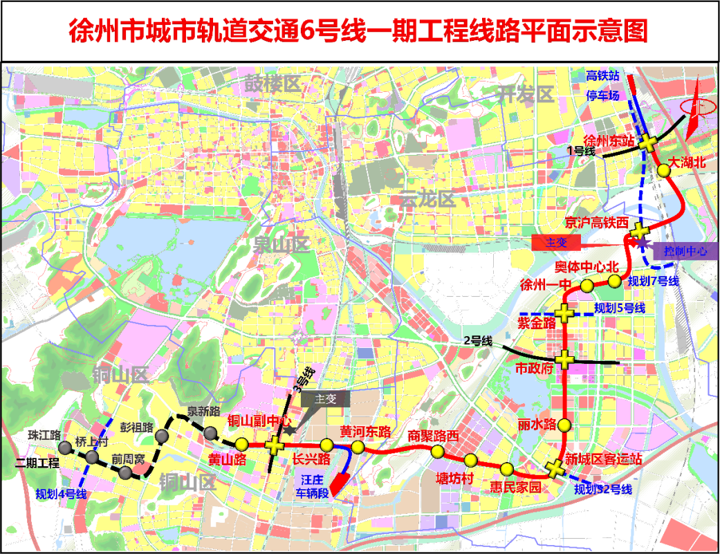 徐州轨道交通6号线一期自黄山路站到徐州东站,全长22.912公里,共设16座地下站,其中换乘站6座。6号线将串联高铁片区、新城区、铜山片区。一方面增加徐州东站的可达性、加密新城中心区线网密度,同时加强对铜山中心片区的轨道交通覆盖。