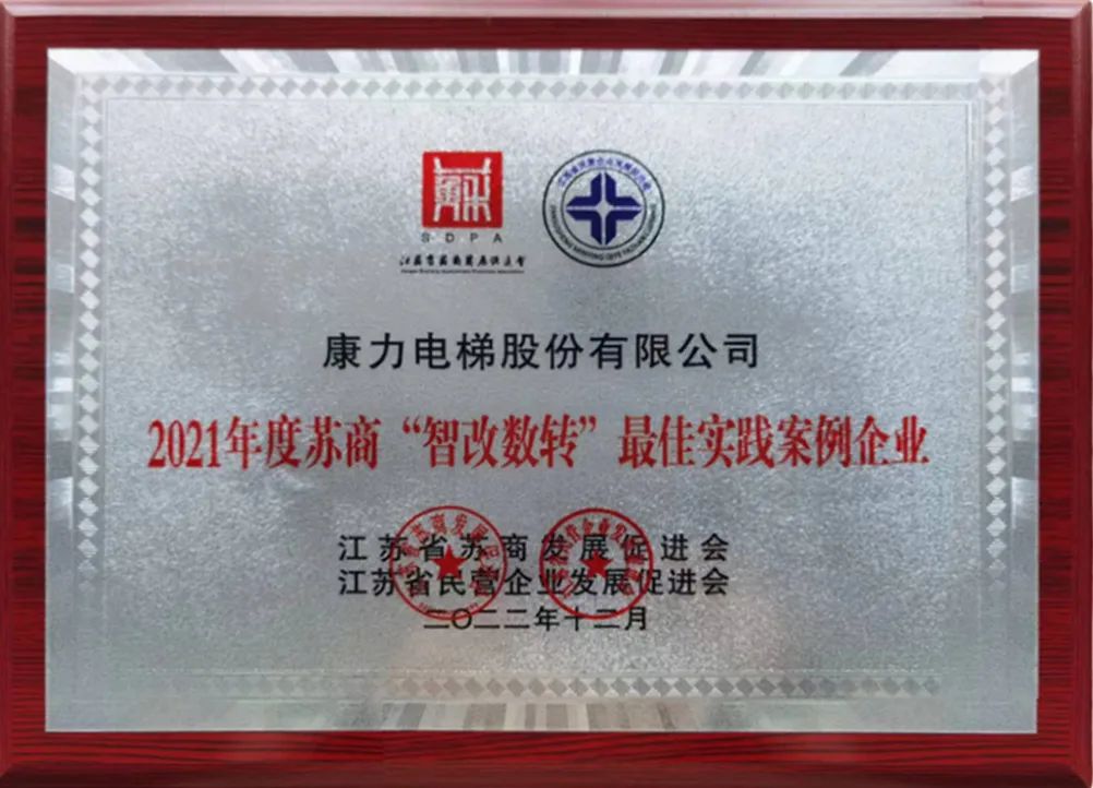 在2022苏商高质量发展榜单的颁奖盛典上,康力电梯董事长王友林荣获“2021年度苏商实业强国突出贡献奖”、康力电梯股份有限公司荣获2021年度苏商“智改数转”最佳实践案例企业。