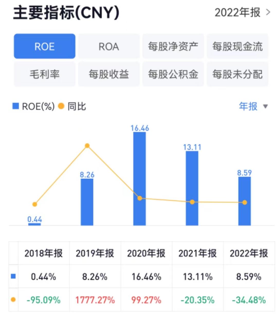 2018年至2022年,康力电梯ROE分别为0.44%、8.26%、16.46%、13.11%、8.59%。