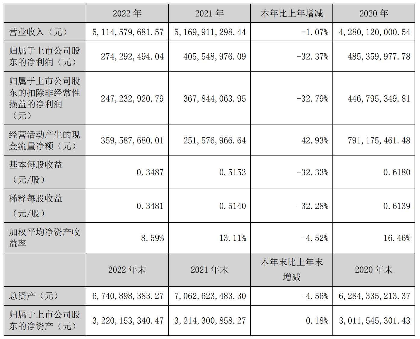 报告期内,公司营业收入51.15亿元,同比减少1.07%;归属于上市公司股东的净利润2.74亿元,同比减少32.37%。