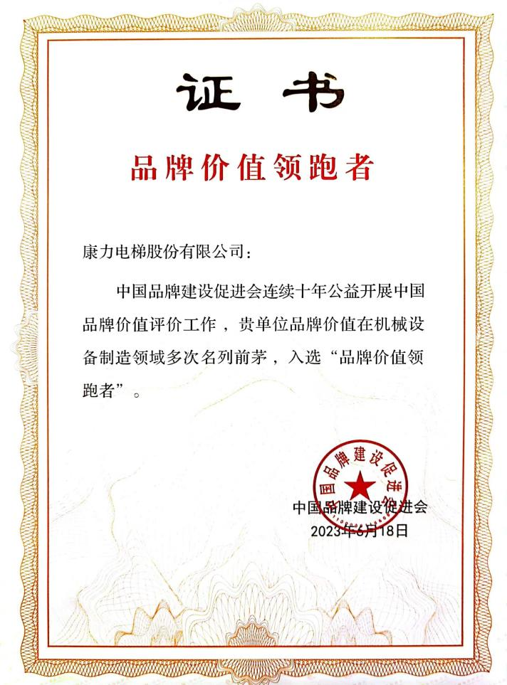 中国品牌建设促进会连续十年公益开展中国品牌价值评价工作,多年来,康力电梯股份有限公司品牌价值在机械设备制造领域名列前茅,荣耀入选“品牌价值领跑者”,是唯一入选的中国电梯品牌。康力电梯副总裁朱瑞华受邀出席会议,并代表公司领取这一重磅奖项。公司同时获评“突出贡献品牌单位”。