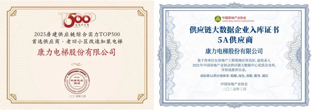 公司同步获评2025房建供应链综合实力TOP500首选供应商·老旧小区改造加装电梯,及2025年中国房地产业协会供应链大数据中心优质企业库“5A供应商”。