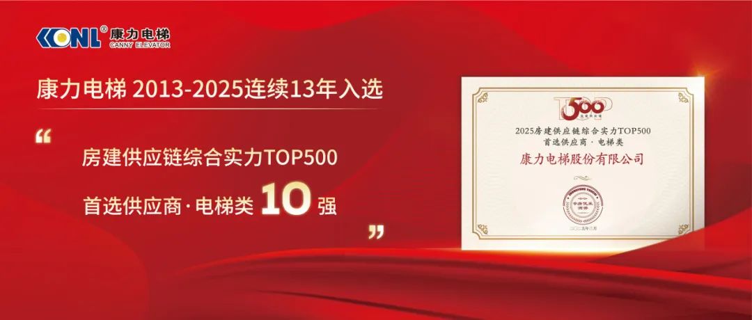 康力电梯凭借稳健卓越的市场表现,连续第13年跻身房建供应链综合实力TOP500首选供应商·电梯类10强,2025年稳居前4。