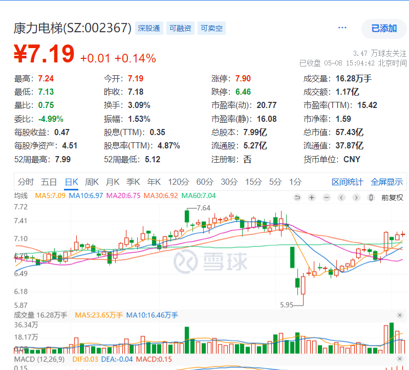 乐居财经李兰 5月8日,截至收盘,康力电梯(002367.SZ)股价涨0.14%,报7.19元/股,总市值为57.43亿元。