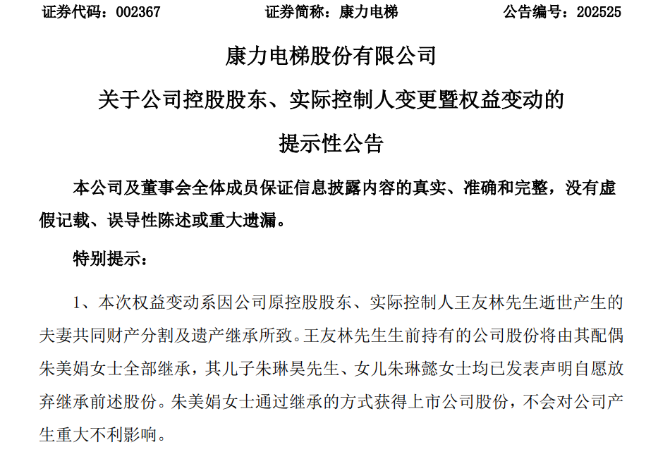 康力电梯表示,王友林生前并未订立遗嘱,也未与他人签订《遗赠扶养协议》。王友林生前持有的公司股份将由其配偶朱美娟全部继承,其儿子朱琳昊、女儿朱琳懿均已发表声明自愿放弃继承前述股份。