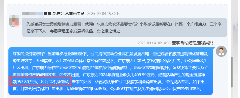 她指出,广东康力所在的地理位置中山南朗的确在深中通道通车后,地理位置有明显提升。调整决策主要是为了提高闲置资产的使用效率,即使不出售,广东康力2024年度营业收入1409.99万元,经营活动产生的现金流量净额957.80万元,对公司不是包袱。