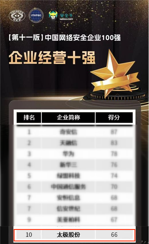 近日,国内权威网络安全媒体、第三方安全咨询机构安全牛正式发布第十一版《中国网络安全企业100强》。太极计算机股份有限公司(以下简称“太极股份”)凭借在数据安全领域领先的技术优势和优异的市场表现以及企业综合实力,再次入选中国网络安全企业100强,位列全国第18名,并同时入选“企业经营十强”。