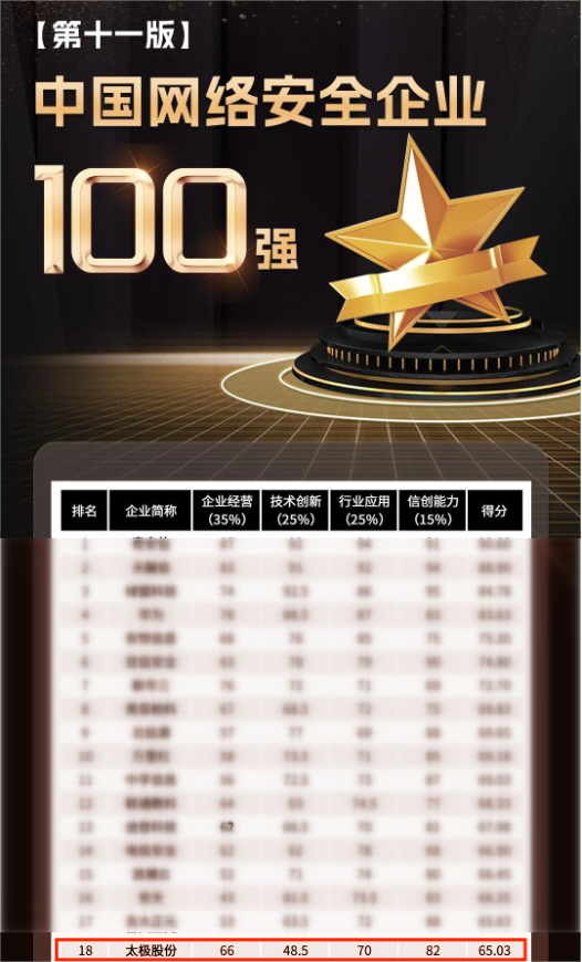 此次发布的《中国网络安全企业100强》是安全牛百强报告的第十一版,从企业经营、技术创新、行业应用、信创能力四大维度,对我国有代表性的网络安全企业的综合竞争发展能力进行研究与评价。太极股份从300余家安全厂商(服务商)中突围,充分证明了业界对公司市场服务、研发创新、产品技术等多方面强大实力的认可。
