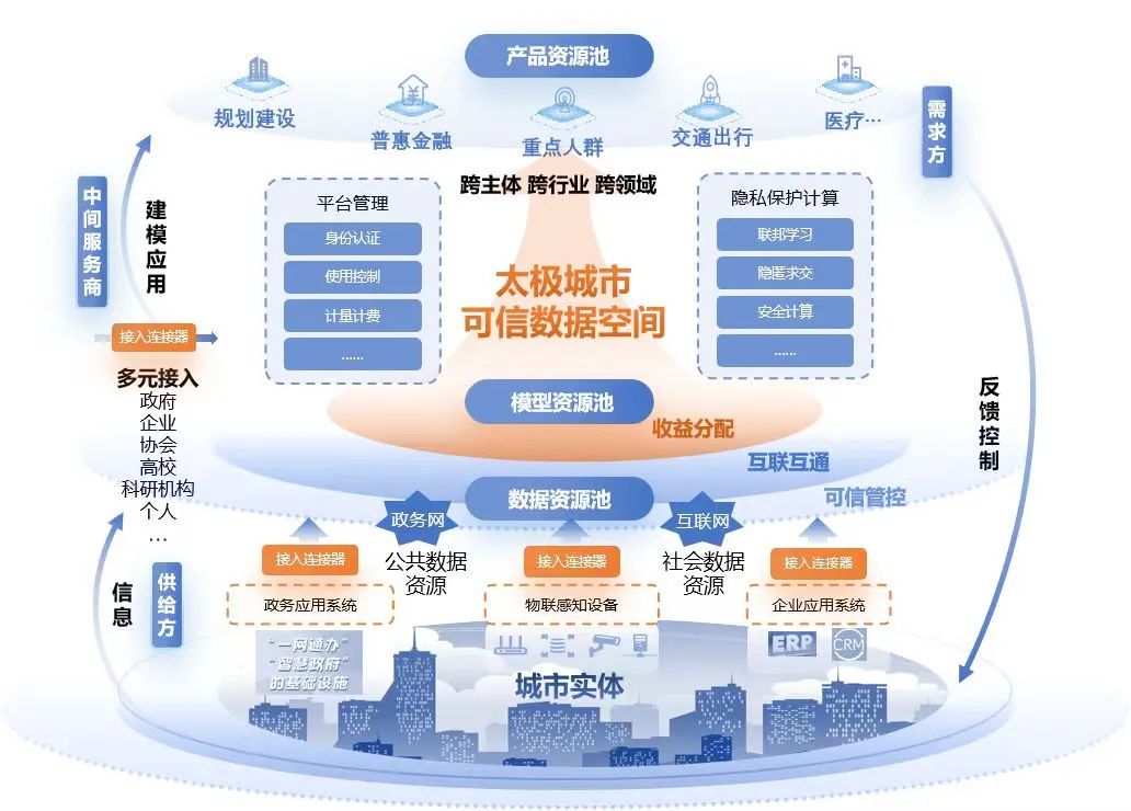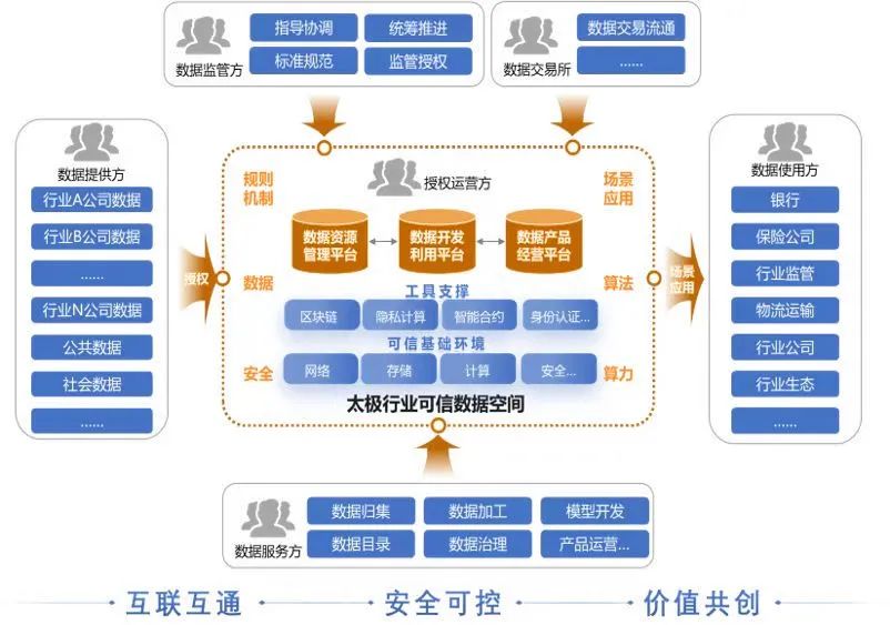 正是基于此方向,“太极可信数据空间 V1.0”正式发布,其包含数据资源供给、数据产品开发、数据产品产品经营三大平台,对应着相关政策中“持有权”、“使用权”、和“经营权”,“三权分置”的数据产权制度框架。