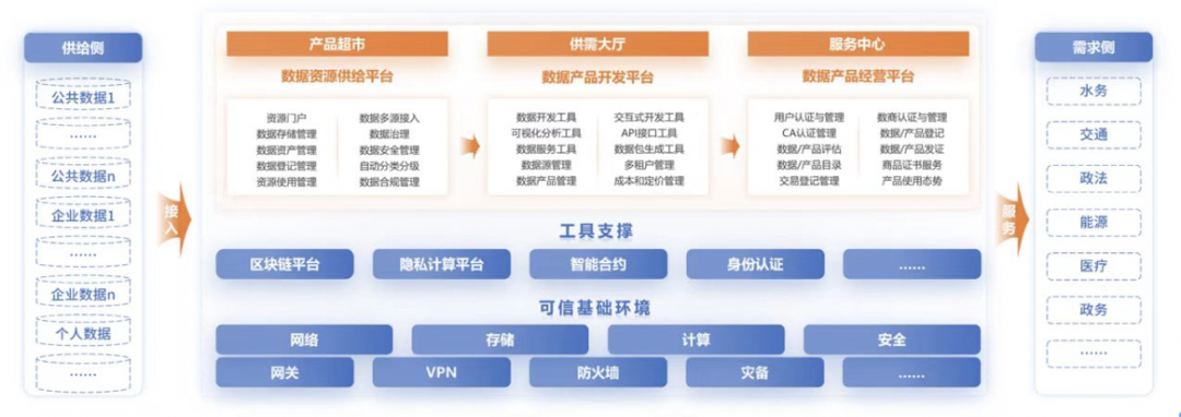 其中,“数据资源供给平台”可理解为“产品超市”,用户带着需求进入“超市”,并检索相关数据产品;“数据产品开发平台”可理解为“供需大厅”,如果没有成熟的产品,用户可向开发商进一步提出需求,汇聚融合多源数据进行开发;“数据产品经营平台”则可理解为“服务大厅”,可对数据产品提供评估、登记、认证等服务,为供需双方提供数据运营服务。