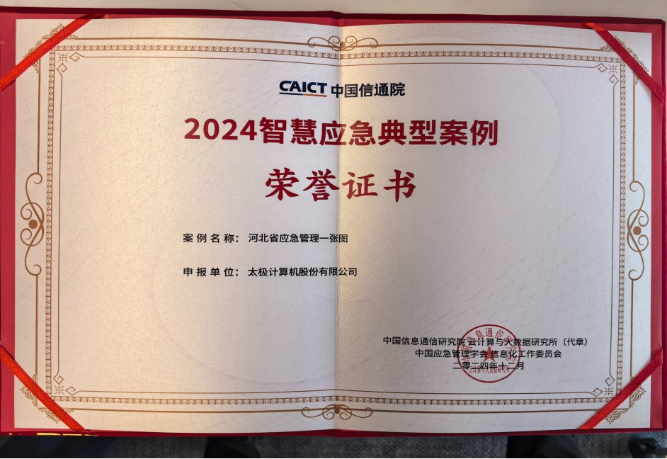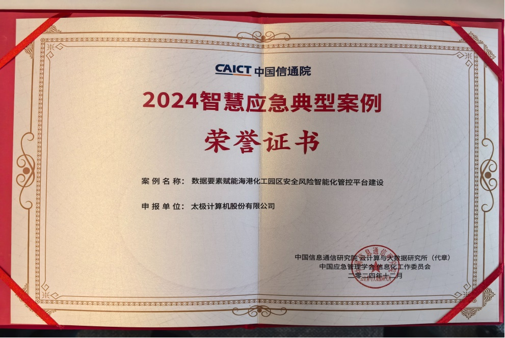 大会重磅发布应急行业系列成果,太极股份《河北省应急管理一张图》、《数据要素赋能海港化工园区安全风险智能化管控平台》荣获了由中国信通院联合中国应急管理学会信息化工作委员会共同评选的“2024智慧应急典型案例”奖项。