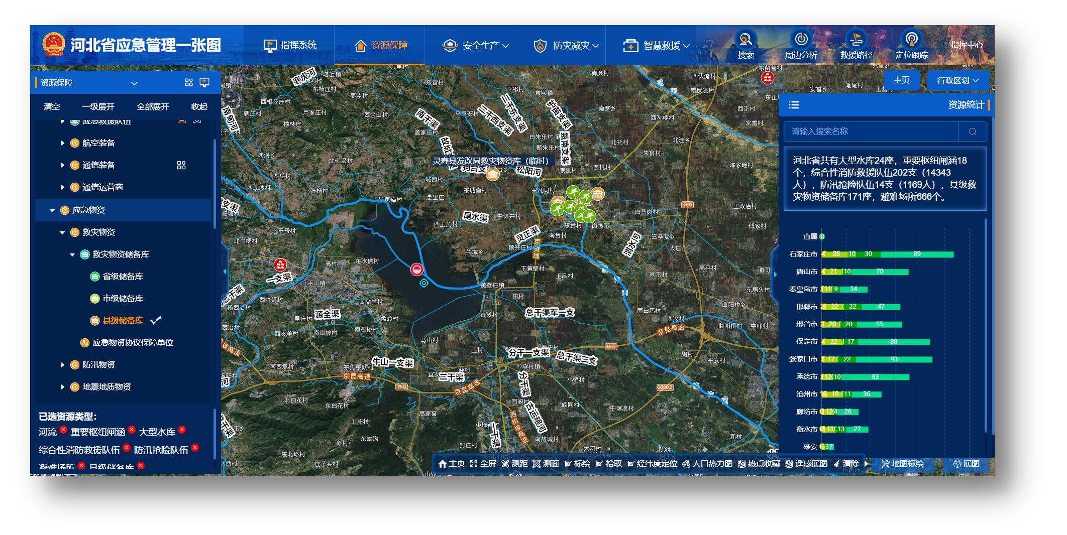 河北省应急管理一张图,汇聚、整合了全省各类资源数据,结合静态与动态数据关联展示,基于数据融合和通信融合技术,实现一张图资源查询分析,一张图监看监测预警,一张图指挥调度。功能包括资源保障、安全生产、防灾减灾、应急救援与指挥系统五个功能板块,覆盖“事前、事发、事中、事后”应急管理业务的全过程,实现平战结合,平时辅助于日常监管,监测预警,应急时支撑科学决策,快速处置,形成“智慧应急”应用,提升应急管理信息化智能化水平。