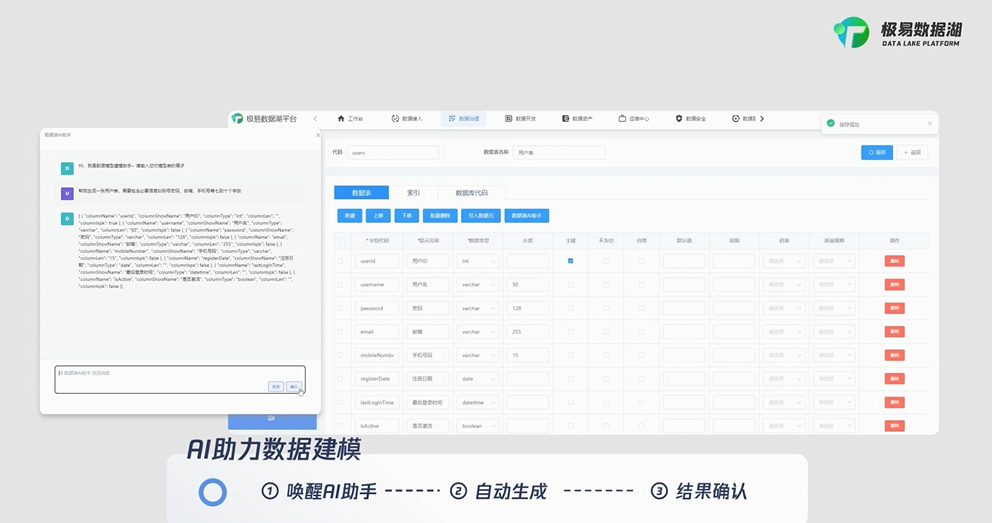 通过直观的交互界面,用户可快速完成数据治理标准模型的创建,大幅降低技术门槛。平台新增“数据湖AI助手”,支持自然语言交互,将复杂的数据准备工作简化为“一句话指令”,建模效率提升显著。