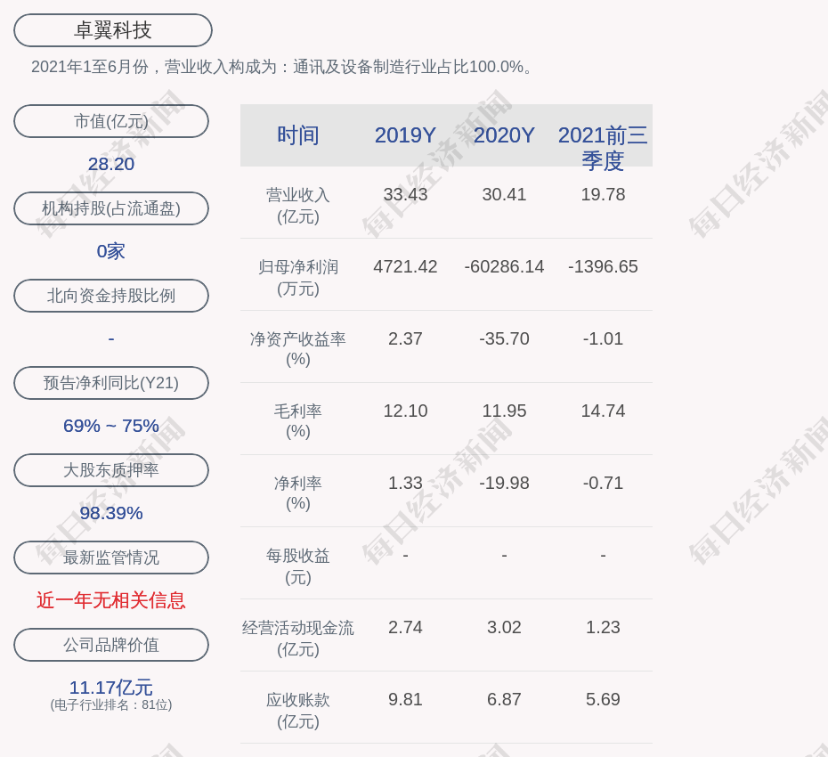2021年1至6月份,卓翼科技的营业收入构成为:通讯及设备制造行业占比100.0%。