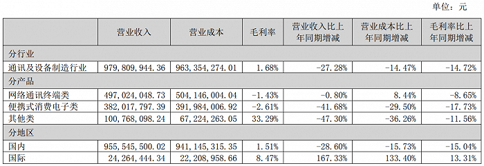 整体来看,今年上半年卓翼科技各业务营收均下滑,其中便携式消费电子业务、其他类业务营收下滑均在40%以上;从毛利率表现来看,各业务毛利率均下滑,且营收占比最高的两大业务毛利率均为负。