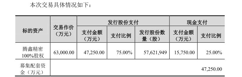 同年9月,卓翼科技披露关联交易预案:公司计划通过发行股份及支付现金方式收购腾鑫精密100%股权,交易价格为6.30亿元。同时,卓翼科技拟向小米科技(武汉)、光谷投资等不超过10名特定对象配套募资4.73亿元。