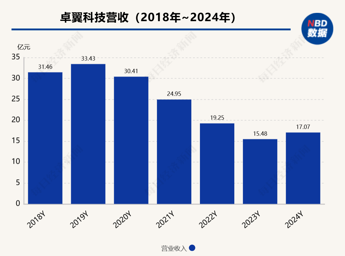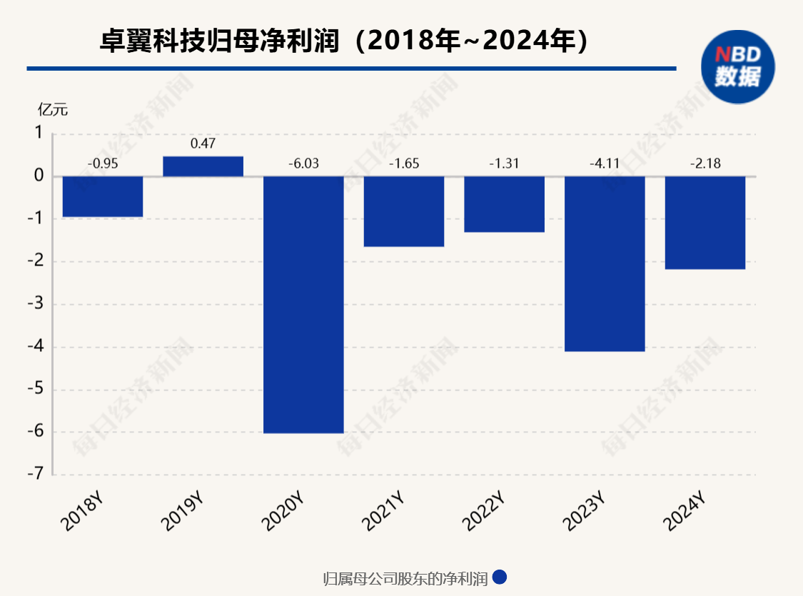 虽然服务华为、小米等知名终端客户,但卓翼科技已连续五年亏损。2020年至2024年,卓翼科技营业收入从30.41亿元降至17.07亿元;对应归属于上市公司股东的净利润分别为-6.03亿元、-1.65亿元、-1.31亿元、-4.11亿元和-2.18亿元,累计亏损逾15亿元。