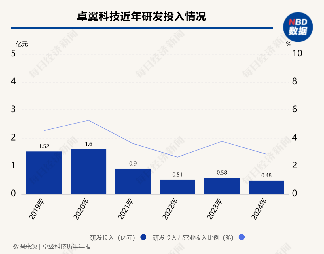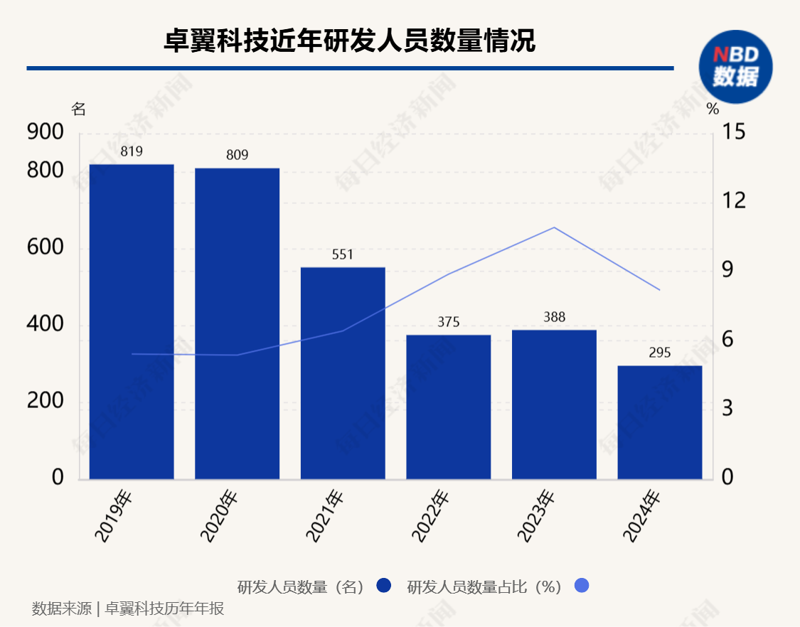 2019年,卓翼科技的研发投入为1.52亿元,研发投入占营业收入比例为4.53%,研发人员为819人。2024年,公司研发投入已降至4846.79万元,研发投入占营业收入比例降至2.84%,研发人员数量减少至295人。