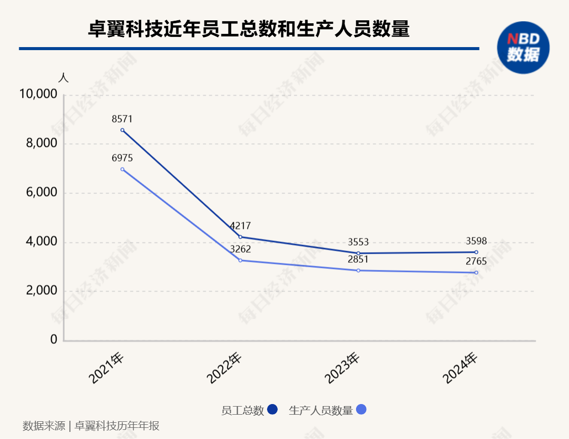 需要注意的是,近年来,卓翼科技的员工规模也在减少。以生产工人为例,在新增生产基地情况下,2021年末员工数量为8571人,2022年末为4217人,分别对应生产人员6975人和3262人;2023年末、2024年末生产人员数量分别为2851人、2765人,也就是说,生产人员数量4年间减少逾六成。