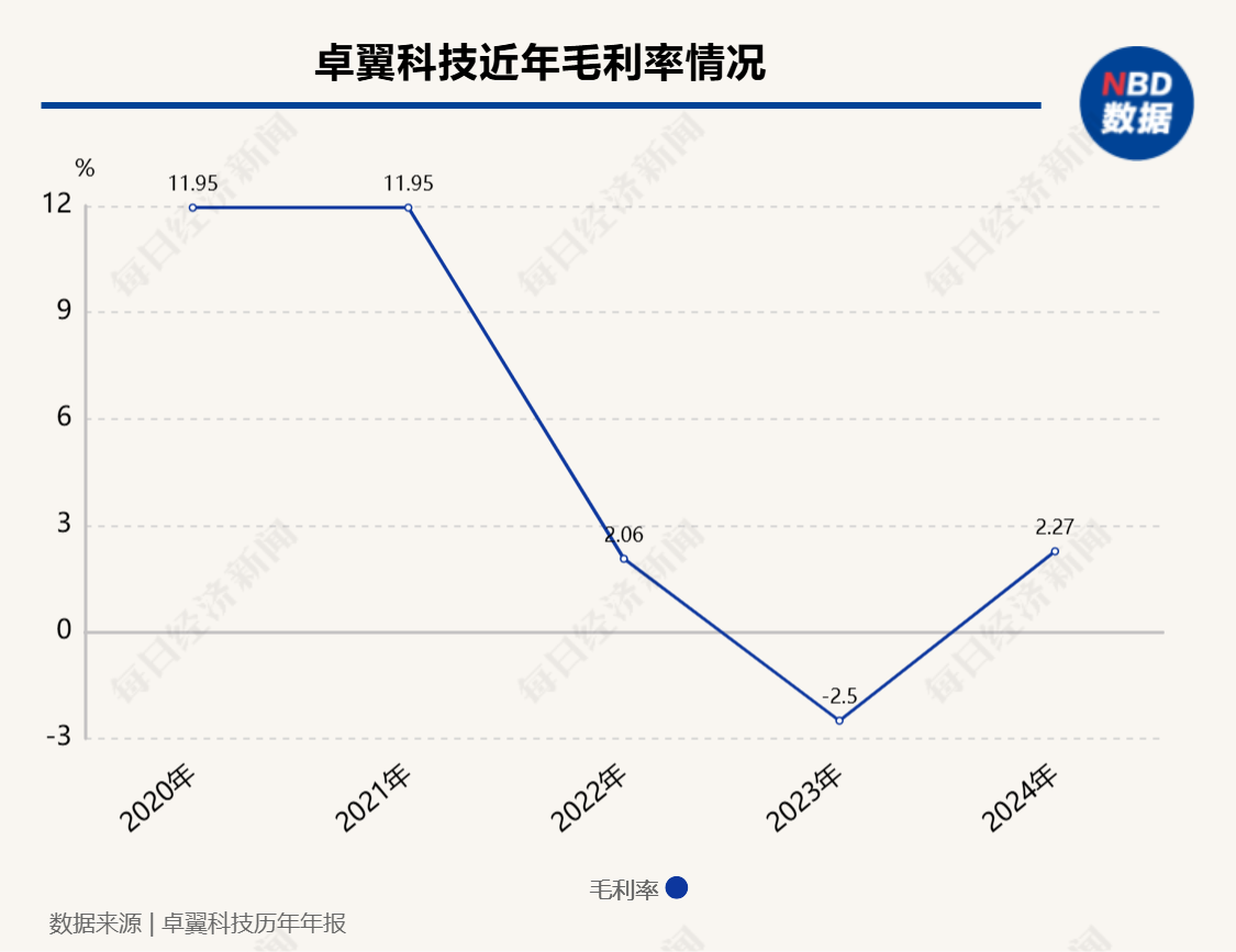 2024年,通讯及设备制造行业对卓翼科技的营收、归母净利润贡献度均为100%。但近年,卓翼科技的毛利率几乎一路走低,甚至一度为负数。不过,2024年公司情况有所好转:毛利率为2.27%,同比增长4.77个百分点。