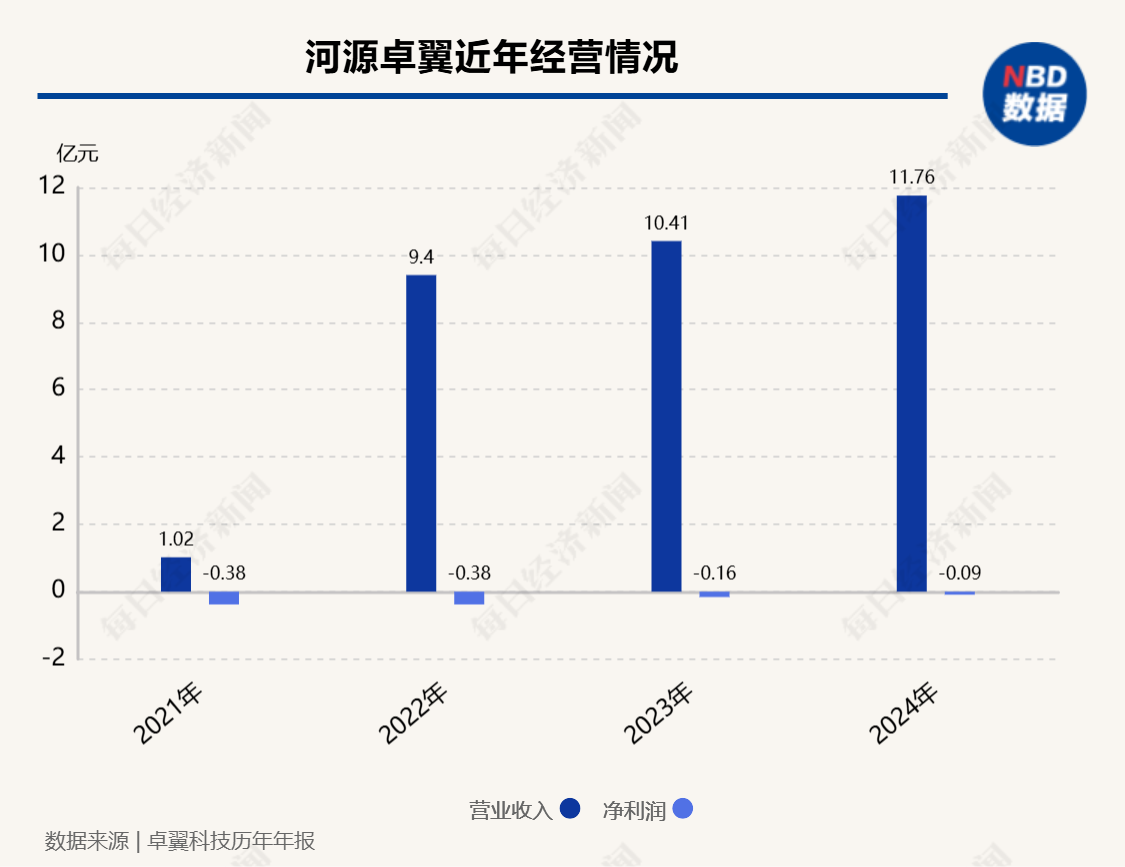 不过,这个被寄予厚望的“明星项目”自建成投产以来,一直处于亏损状态。2021年—2024年,河源卓翼的收入分别是1.02亿元、9.4亿元、10.41亿元和11.76亿元,净亏损分别为3753.93万元、3794.73万元、1569.11万元及923.37万元。