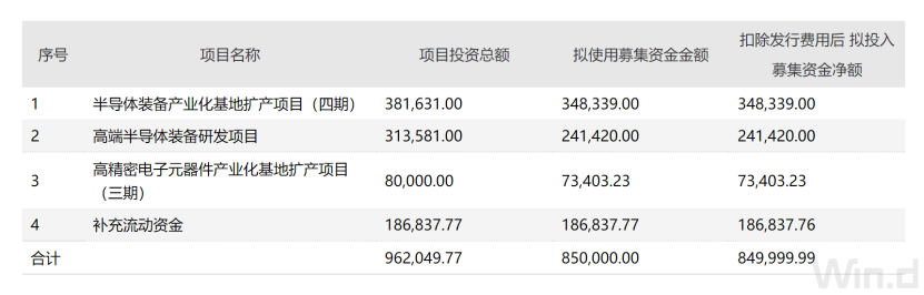 根据投资者认购情况,此次非公开发行的股票数量为2796.0526万股,募资总额近85亿元,主要用于半导体装备产业化基地扩产项目(四期)、高端半导体装备研发项目、高精密电子元器件产业化基地扩产项目(三期)以及补充流动资金四大方向。