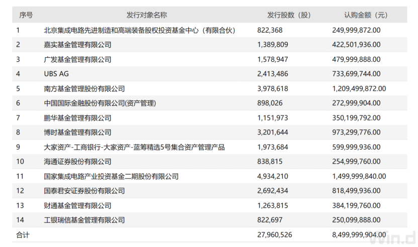 从最终认购情况来看,其中,国家集成电路产业投资基金二期股份有限公司(以下简称大基金二期)认购15亿元,南方基金认购12.09亿元,博时基金认购9.73亿元,UBS认购7.34亿元,广发基金和嘉实基金分别认购4.8亿元、4.23亿元,北京集成电路先进制造和高端装备股权投资基金中心认购2.5亿元。