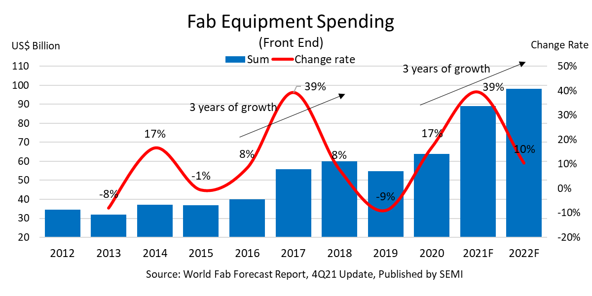 针对产业景气度会在接下来继续保持,SEMI持有类似的观点,SEMI在今年1月的预测报告中认为,全球前端晶圆厂设备支出预计将在2022年同比增长10%,达到超过980亿美元的历史新高,这标志着连续第三年的增长。