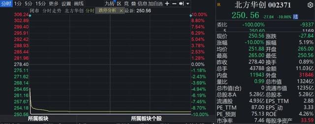 10月10日,北方华创开盘快速跌停。截至收盘,报250.56元/股,总市值为1323.82亿元。除北方华创外,芯片半导体板块整体下跌,安集科技、雅克科技跌停,中微公司大跌19.4%,兆易创新、华润微、通富微电等跟跌。