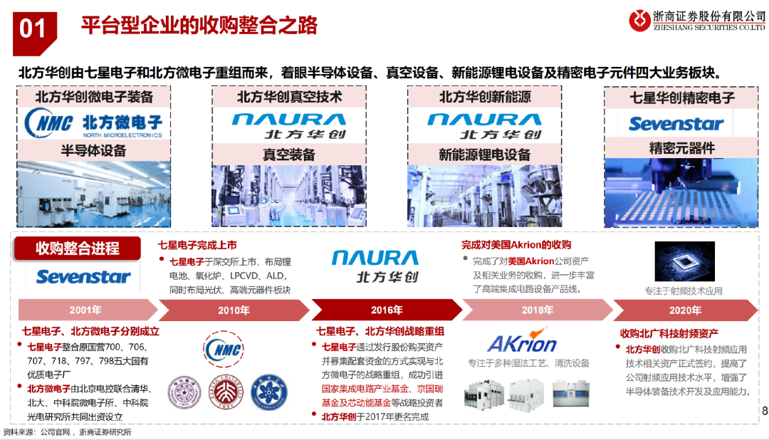 北方华创由七星电子和北方微电子战略重组而成。2001年七星电子成立,主营产品为集成电路制造设备、电子元件,同年北方微电子成立,主营半导体刻蚀、PVD、CVD设备等。