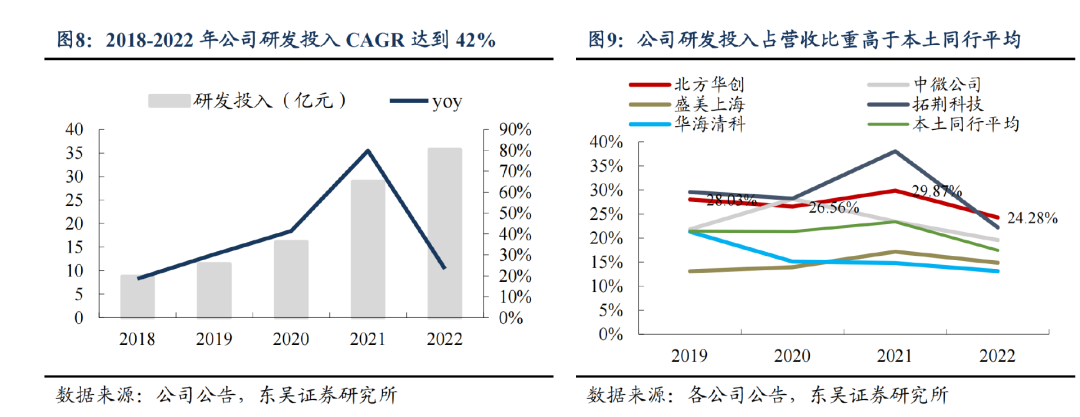 我们知道,科技类企业想要领先同行最重要的就是保持技术领先,作为行业龙头的北方华创,一直高度重视研发端投入,2022年公司研发支出达到35.66亿元,2018-2022年CAGR达到42%。