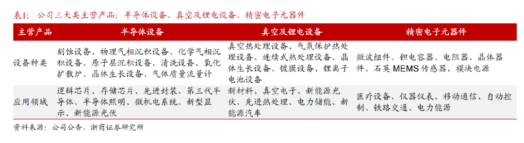 公司电子工艺装备主要包括半导体装备、真空装备和新能源锂电设备,电子元器件主要包括电阻、电容、晶体器件、模块电源、微波组件等,也是目前国内唯一一家平台级半导体设备厂商。